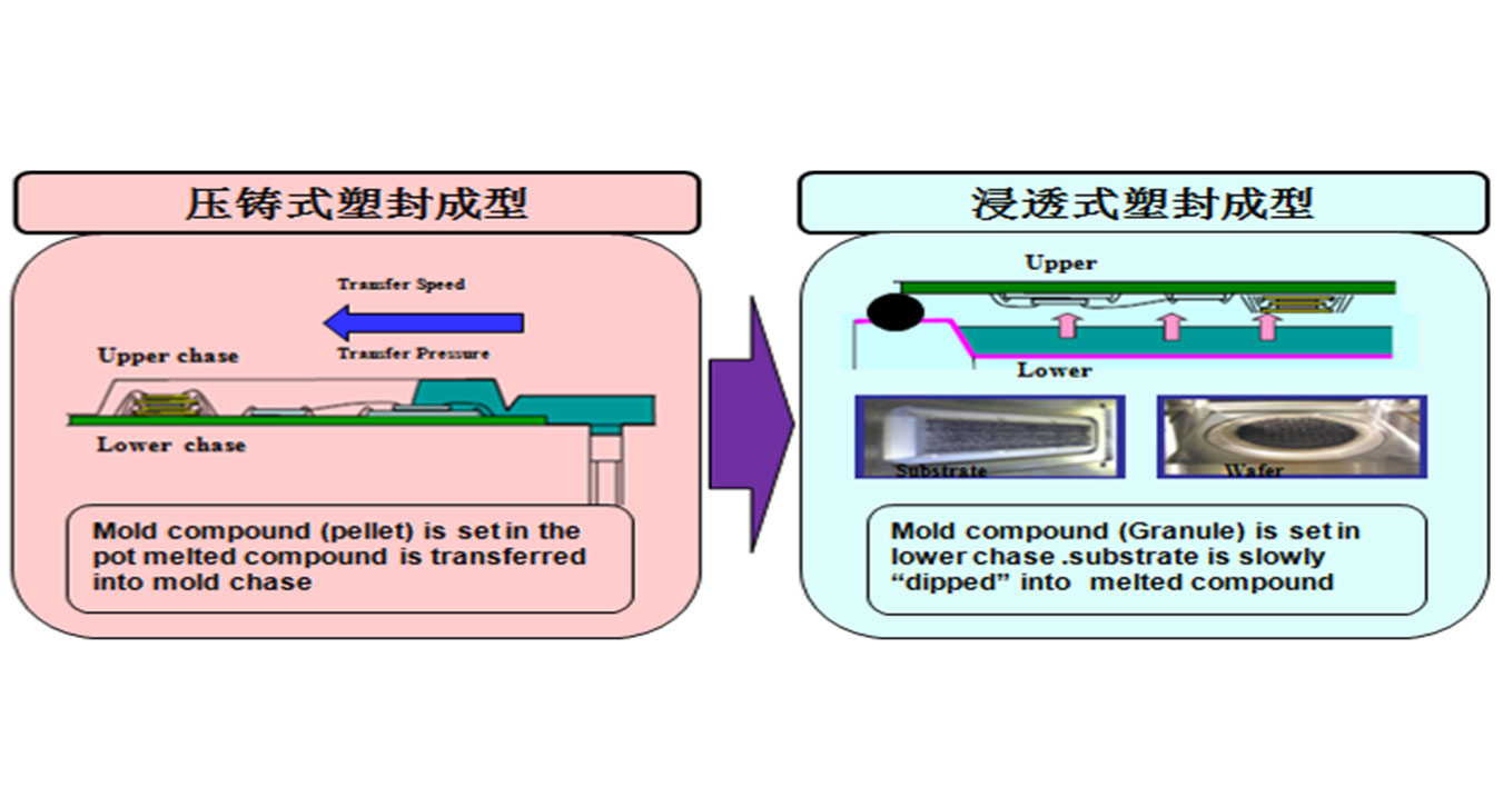 从压铸式塑封升级为浸入式塑封,使封胶制程更稳定。拥有超薄基板应对能力,实现高堆叠,细间距封装低压力应对,产品无气孔、无流痕、无冲线;同时,柔性可调节产品厚度的能力。